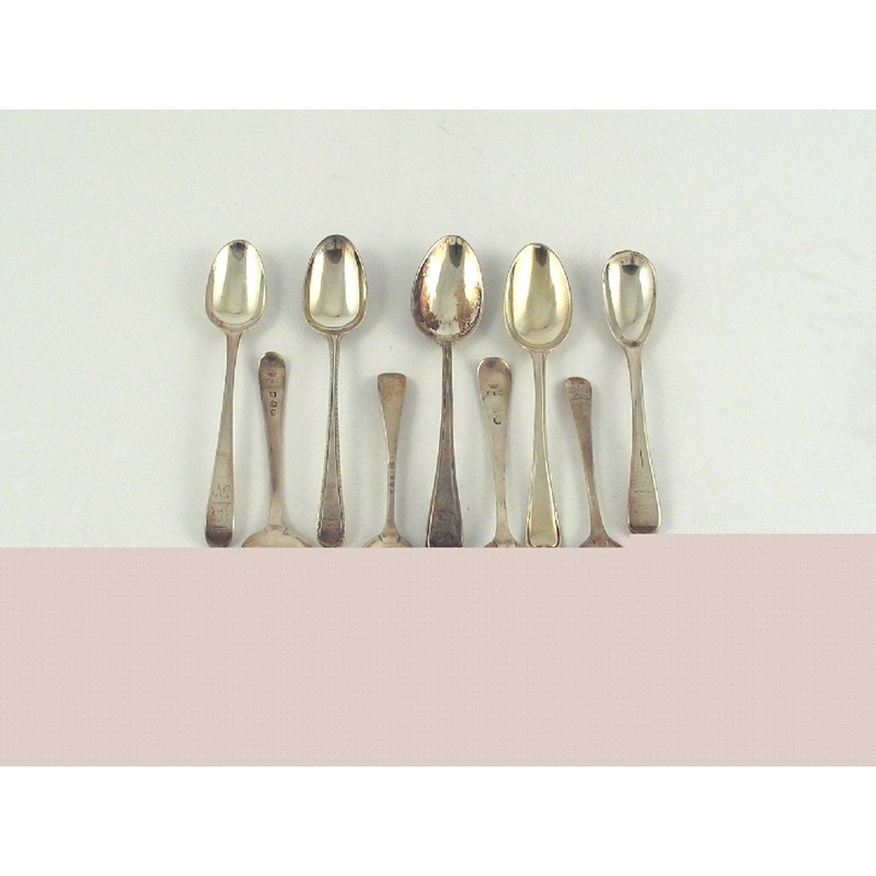 A mixed lot of flatware:  a set of eleven George III feather edge teaspoons, thirteen assorted saltspoons, a set of five George III mustard spoons, a pair of sugar tongs, a George II fancy-front teaspoon and thirteen other teaspoons, 20oz. (44)