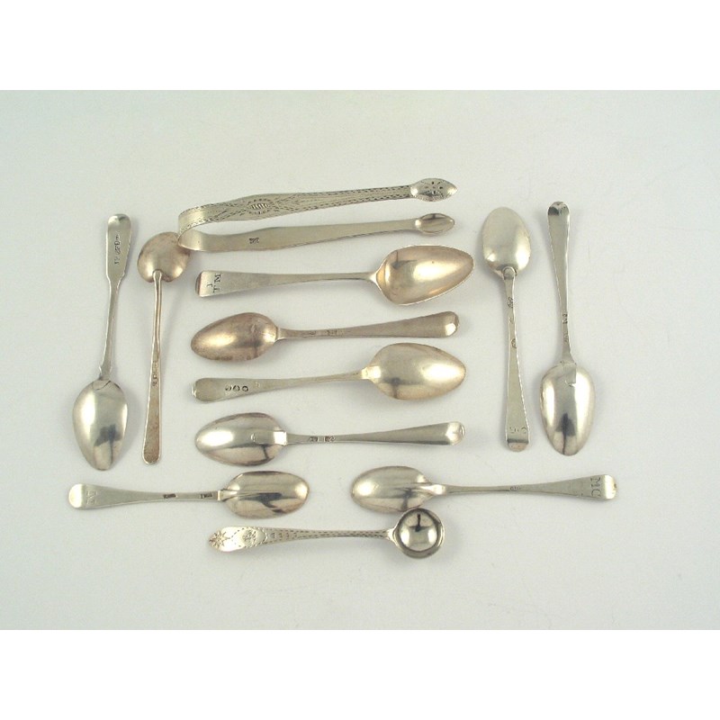 A mixed lot:  a pair of Hester Bateman sugar tongs,   a set of six feather edge teaspoons, by Hester Bateman, a George III Irish teaspoon, a single teaspoon, by Hester Bateman, two rattail teaspoons, an Irish saltspoon, a Dumfries teaspoon, by David Gray, a modern teaspoon and ten George III teaspoons, 10oz. (lot)