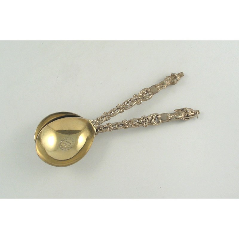A pair of Victorian parcelgilt, figure terminal spoons  with cast, openwork stems, crested, by Francis Higgins, London 1872, 5.5oz. (2)