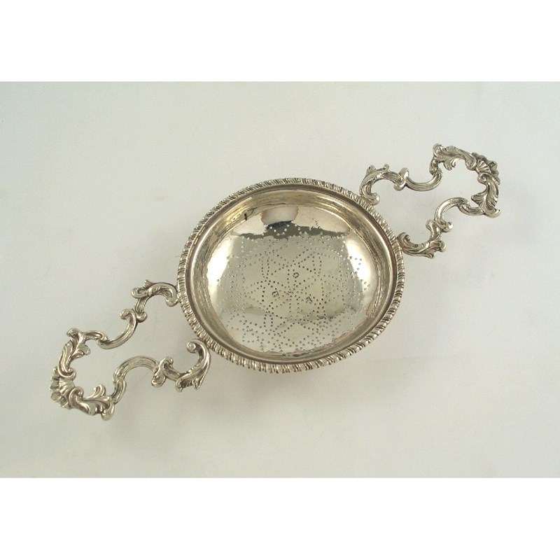 A George III lemon strainer, with a pierced, circular bowl and twin, open scroll handles, maker's mark partially lost in piercing, London 1766, 11in (28cm) wide, 5.25oz.