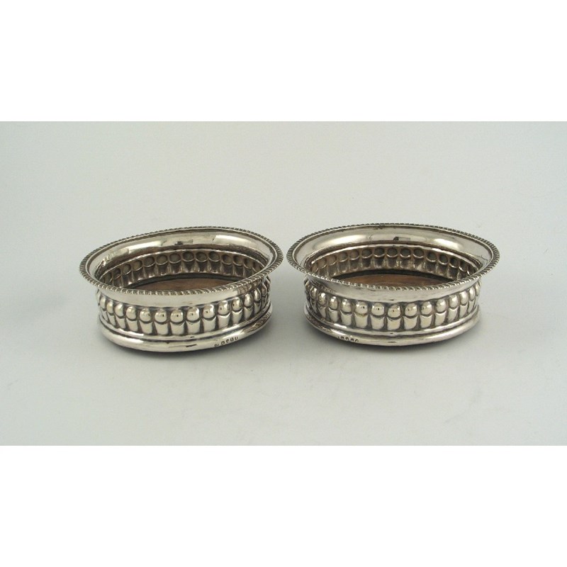 A pair of George III wine coasters, with fluted sides flared, gadrooned rims and turned wooden bases, by Solomon Hougham, London 1814, 6.1in (15.5cm) diameter.