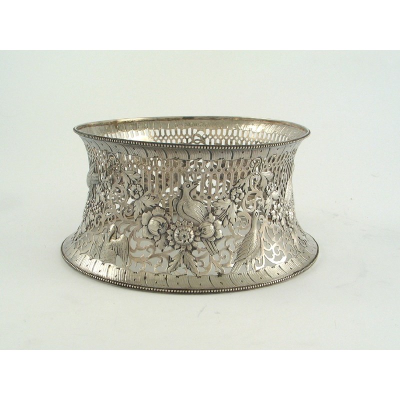 A modern Irish dish ring, of conventional spool form with bead borders, pierced around the sides and embossed with birds and festoons of flowers, pricked out with engraved and chased detail, by West & Son, Dublin 1916, 8.25in (21cm) diameter, 10.25oz.