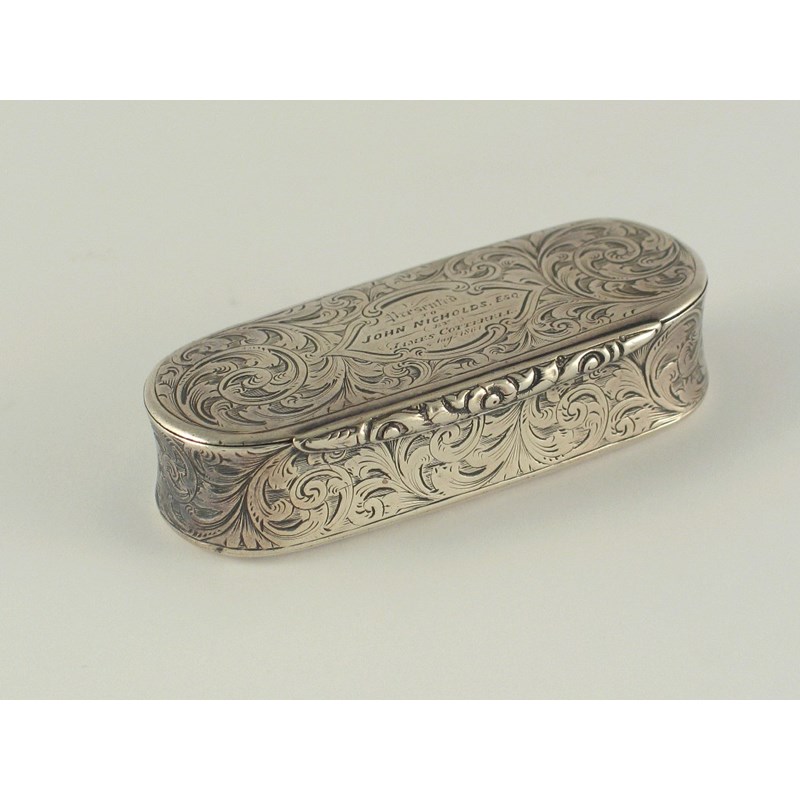 A Victorian engraved snuff box, of rounded oblong form with a chased thumbpiece and a small inscription on the cover, by Hilliard & Thomason, Birmingham 1860, 3in (7.5cm) long, 1.8oz.