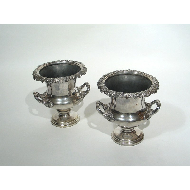 A pair of Old Sheffield plated wine coolers, of campana form with twin foliate scroll handles, pedestal bases and everting borders of fruiting vines (lacking liners and collars), crested c.1840, 10in (25.5cm) high. (2)