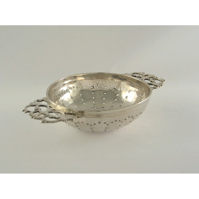 A George I lemon strainer, with two open work scroll handles and a circular bowl with a radiating pattern of holes, by William Looker, London 1718, 5in (12.8cm) 2oz.
