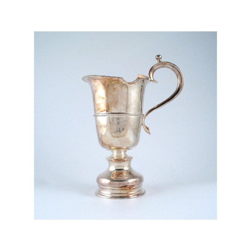 A modern helmet shaped ewer, on a domed pedestal foot, engraved with a coat of arms and the dates, "1440-1990", maker "P.LTD", London 1990, 11.3in (29cm) high, 39oz.