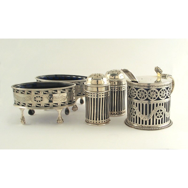 Pierced condiments with blue glass liners: a mustard pot, by Stokes & Ireland Ltd, London 1903, a pair of oval salts, by T. Bradbury, London 1900 and a pair of cylindrical pepperettes, by Elkington & Co, Birmingham 1911/12. (5)