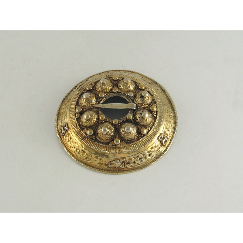 A large domed silver gilt brooch, with eight domed bosses around the centre and applied birds and animals around the border, 5in (13cm), 5.5oz.