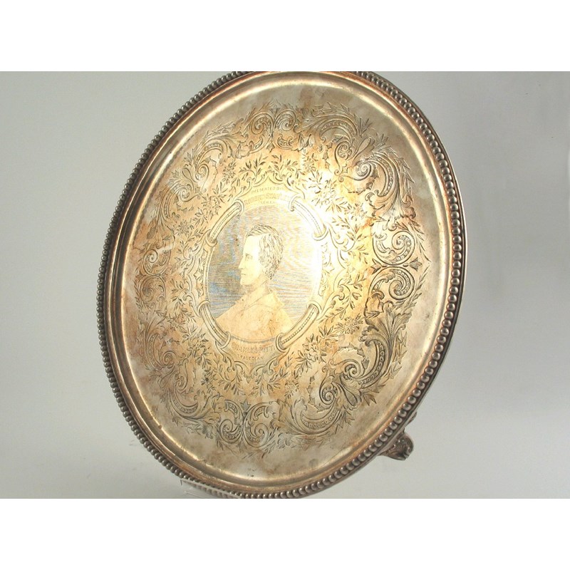 An interesting Victorian plated salver, circular, engraved in the centre with the portrait of "CHARLES PITT - Tragedian *", inscribed "Presented by Robert Stanley 1861" and flanked by floral scroll engraving within a border of large cast beads, cresting on three feet, by R. Stanley & Co c.1861, 16in (41cm) diameter.