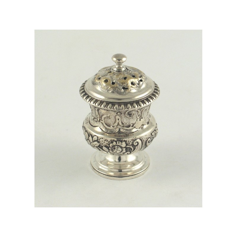 A George III thistle shaped pepper, with embossed decoration and a knop finial, by John Bridge, London 1822, 2.7in (7cm) high, 1.5oz.