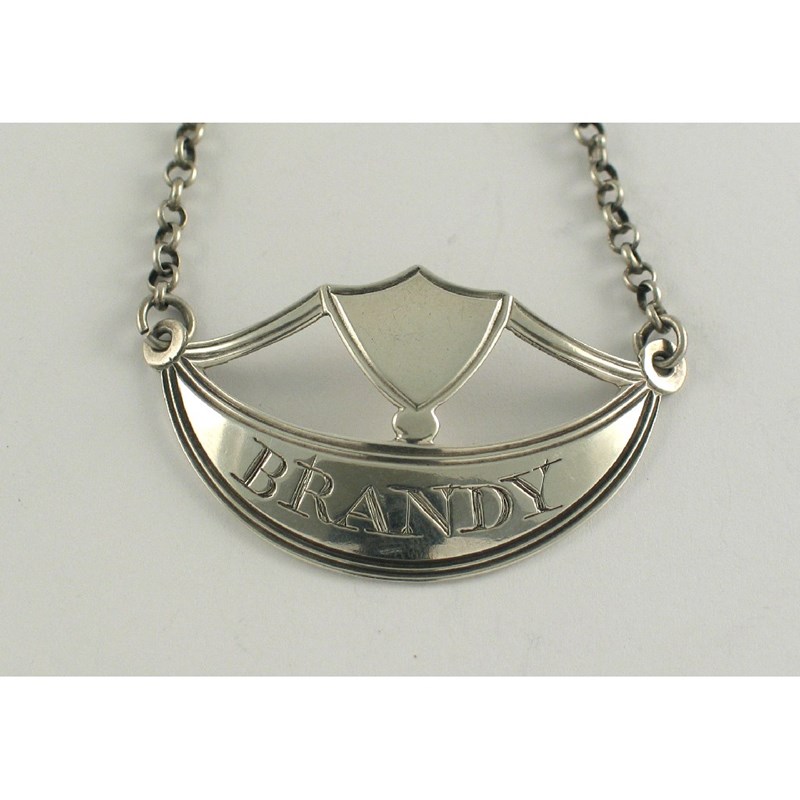 A George III crescent wine label, with shield surmount and thread borders, 'BRANDY', by Allen Dominy, London 1794.