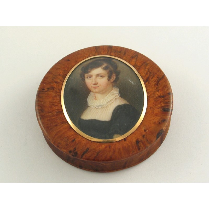 An early 19th century burrwood snuff box, of circular outline with a tortoiseshell lining and an iset miniature portrait of a young lady on the cover, (behind glass) 1810-1830, 3.2in (8cm) diameter.