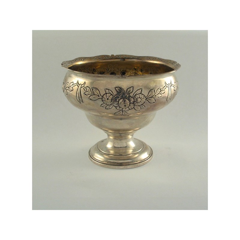 An early George III Scottish sugar bowl, on a pedestal foot, with an everting chased rim, a gilt interior and embossed fruit and floral festoons aroudn the sides, by James Gilsard, Edinburgh 1766, 4.3in (11cm) diameter, 7oz.