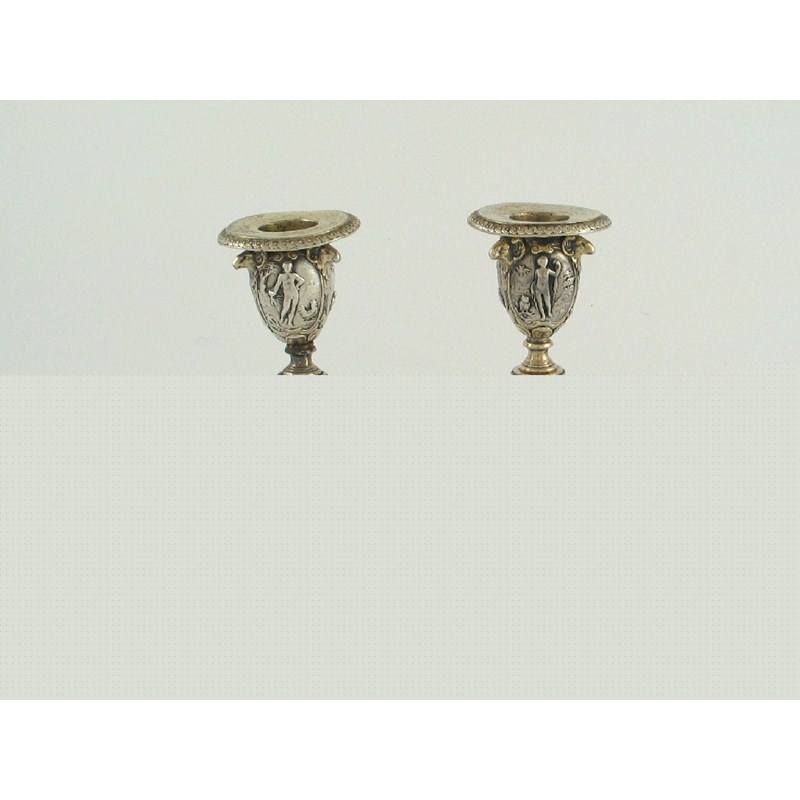 A pair of Victorian parcel-gilt plated candlesticks, relief decorated on domed circular bases with knopped, dwarf columns and urn shaped capitals with ram's mask decoration (one capital detached), by Elkington & Co c.1860, 5.5in (14cm) high. (2)