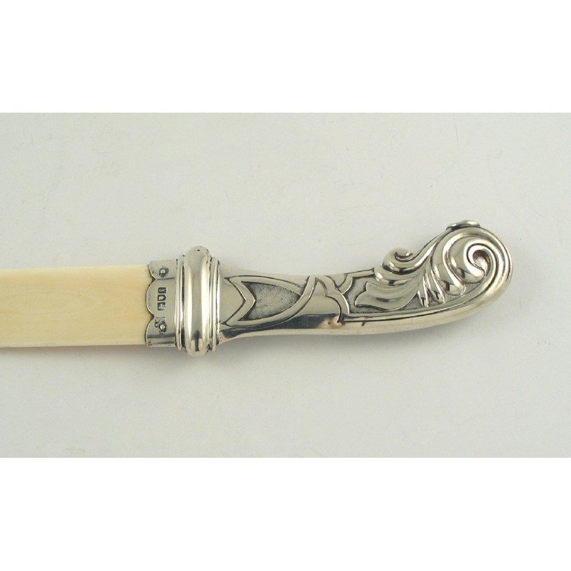 An Edwardian mounted ivory page turner or paperknife, with an embossed, pistol hilt, by Sampson Mordan & Co, London 1901, 13.9in (35.3cm) long.