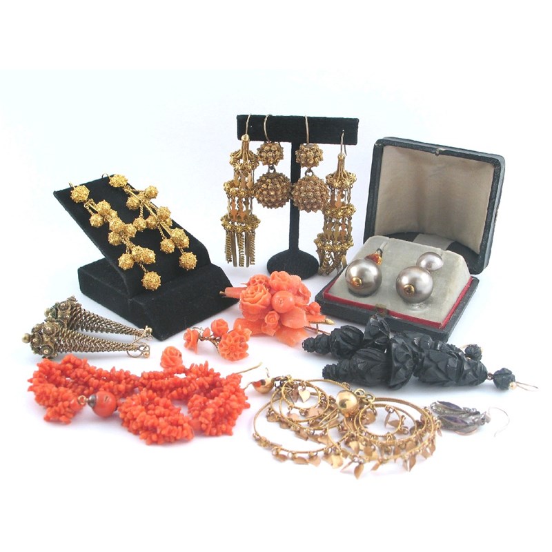 A pair of carved jet earrings, a pair of gilt metal three section tiered earrings, a pair of gilt metal double cannetile earrings, a coral bracelet, a coral brooch, a single coral earring, a pair of paste drop earrings and a pair of cased paste ball earrings.