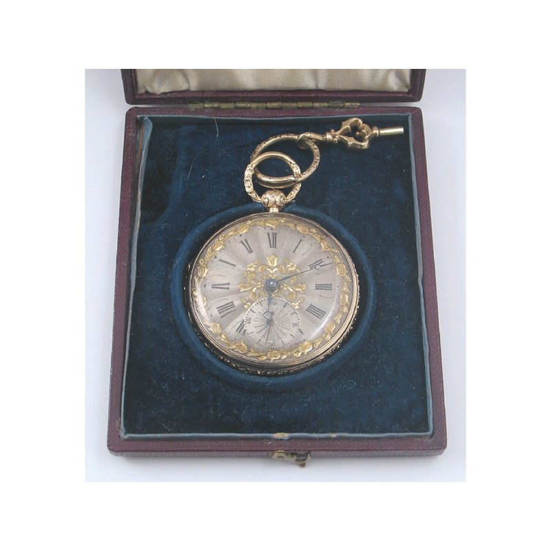 An early Victorian 18ct gold open faced key wind pocket watch, the silver dial with engine turned decoration and subsidiary seconds dial and with gold foliate decoration to the centre section and border, the case marked for Chester 1839, maker LW, with key and split ring, fitted case.