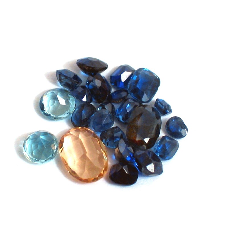 An oval shaped light brown topaz, nineteen sapphires and two aquamarines.