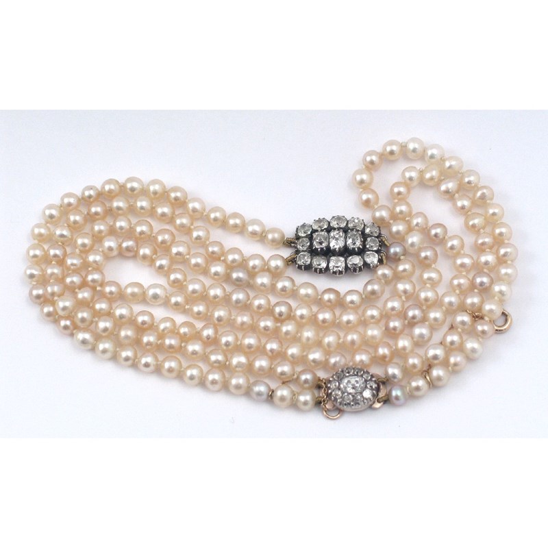 A two row untested pearl necklace, with a George III cushion shaped diamond set clasp and another smaller George III diamond set cluster clasp.