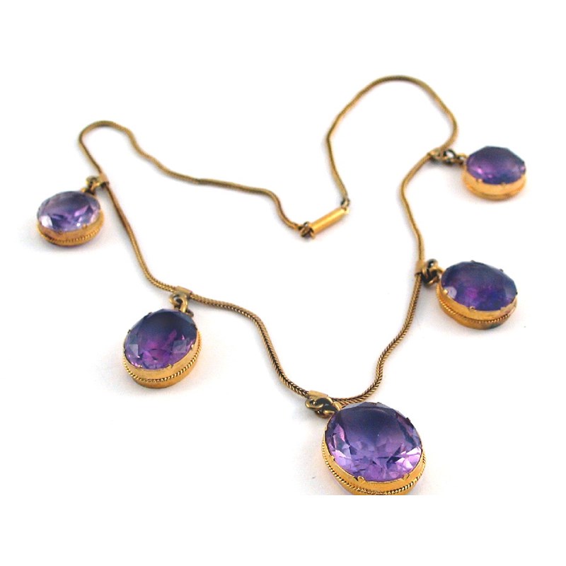 A Victorian gold necklace suspending five amethyst colettes.