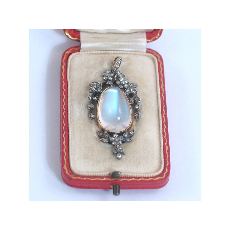 An Edwardian moonstone and diamond pendant, the slightly pear shaped moonstone cabochon is mounted within a foliate border of small diamonds, set in silver and gold, fitted case by Parkes.