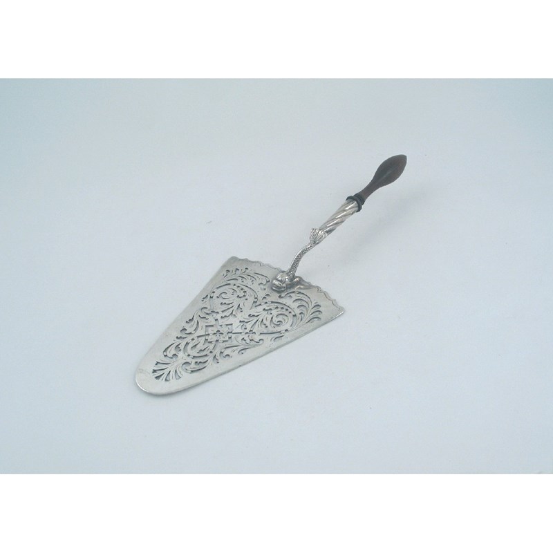 A George III triangular fish slice, pierced with scrolls with a cast dolphin at the junction and a wooden baluster handle with swirl fluting, by Edward Aldridge, London 1766, 12in (30.5cm) long.