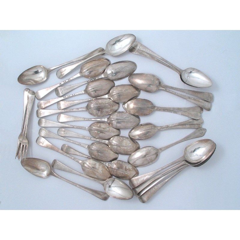 Assorted flatware including: thirteen assorted Hanovarian rattail tablespoons, two Scottish dessert spoons and two further tablespoons, crested, bearing the motto 'ARMA TUENTUR PACEM', (Arms Maintain Peace) four Irish Old English pattern tablespoons by John Craig, Dublin 1771, four other 18th century tablespoons, mixed, five 18th century three prong dessert forks, a late 17th century trefid spoon, with rattail, initialled E.R. by Benjamin Watts, c.1698 and a pair of bright cut tablespoons, by Charles Hougham, London 1786, 57oz. (33)