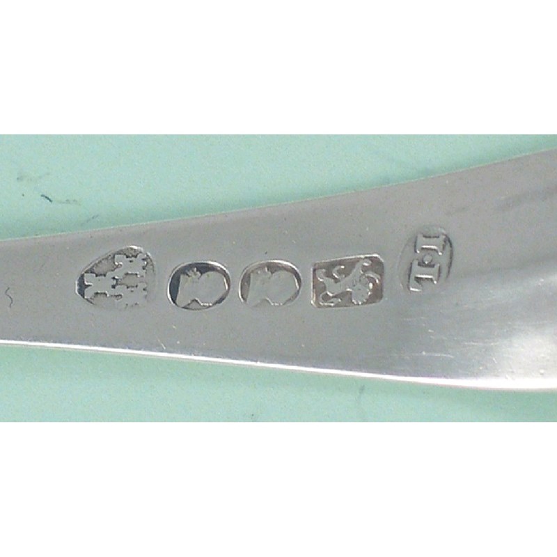 A George III provincial Old English pattern dessert spoon, crested and initialled, by John Langlands, Newcastle 1797 *