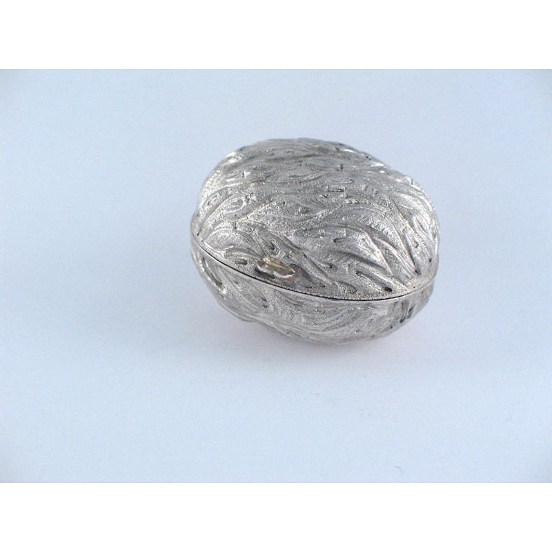 A Victorian naturalistic example, in the form of a walnut with a matted, textured, surface, hinging in the middle, revealing a hinged, bright-steel grater, by Hilliard & Thomason, Birmingham 1881, 1.2in (4.4cm).