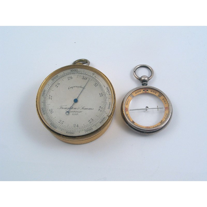 An Edwardian mounted 'watch case' compass, with glass front and back and calibrated chapter ring by Francis Barker & Son Ltd, London 1908; together with a pocket gilt metal aneroid barometer, with silvered dial, blued steel hand and moveable bezel, by Froughton & Simms, London, numbered 1237, in a red leather case. (2)