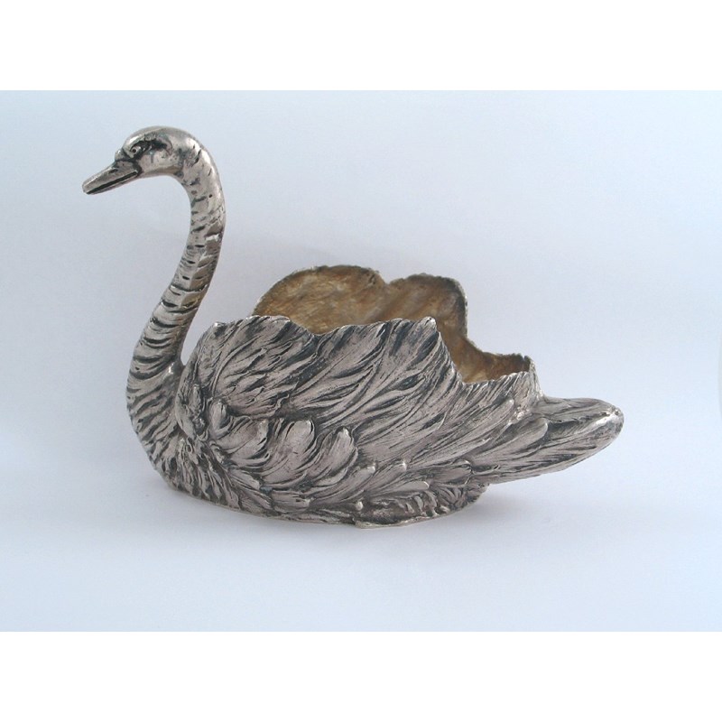 An early 20th century German bon bon dish in the form of a swimming swan with textured plumage and a gilt interior, stamped "W. Kaupert Cassel", c.1910, 4.75in (12.25cm) high, 9.5oz.