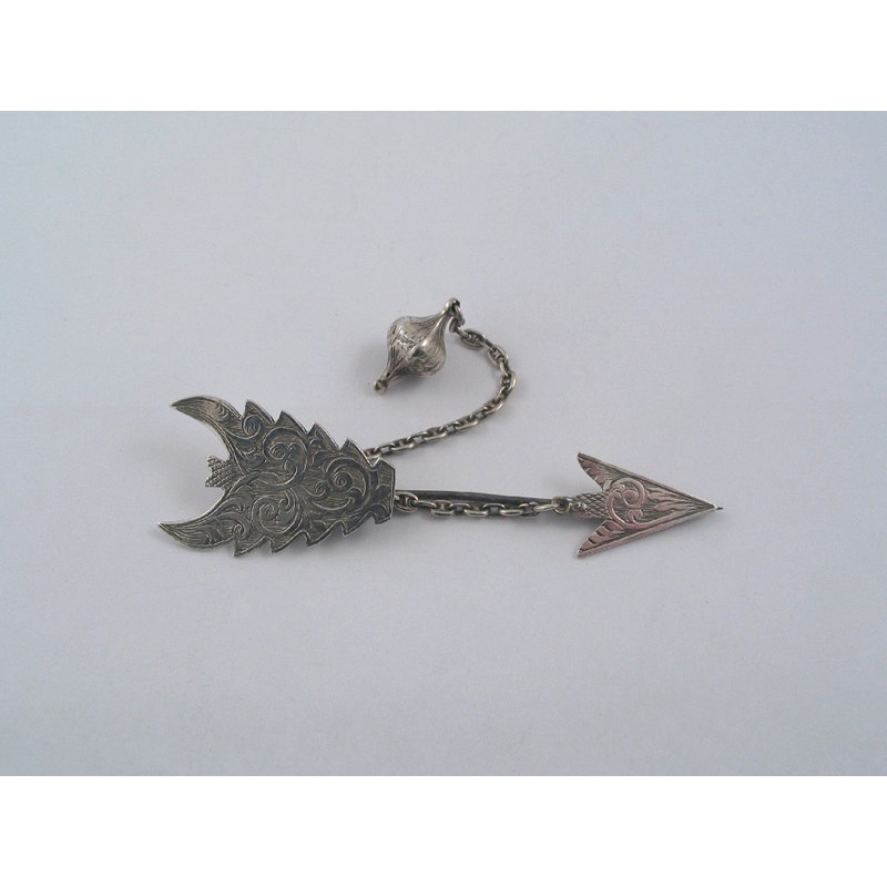 Devon Interest: a Victorian engraved brooch in the form of an arrow with a chain and pendant drop stamped on the back "COMBMARTIN SILVER" * and Regd OCT 21 1847. H.S. ELLIS EXETER", by H Ellis, Exeter 1847, 3.4in (8.5cm) long, 1oz.