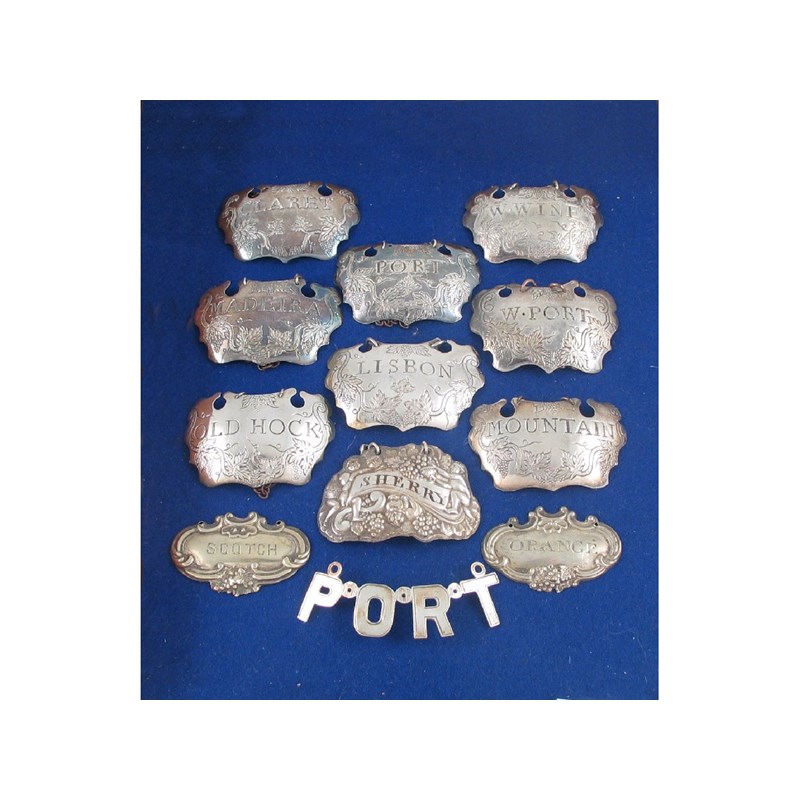 A set of eight Old Sheffield plated escutcheon wine labels c.1760, an Old Sheffield Bacchanalian "SHERRY" and three Victorian electroplated labels "SCOTCH", "PORT" and "ORANGE". (12)