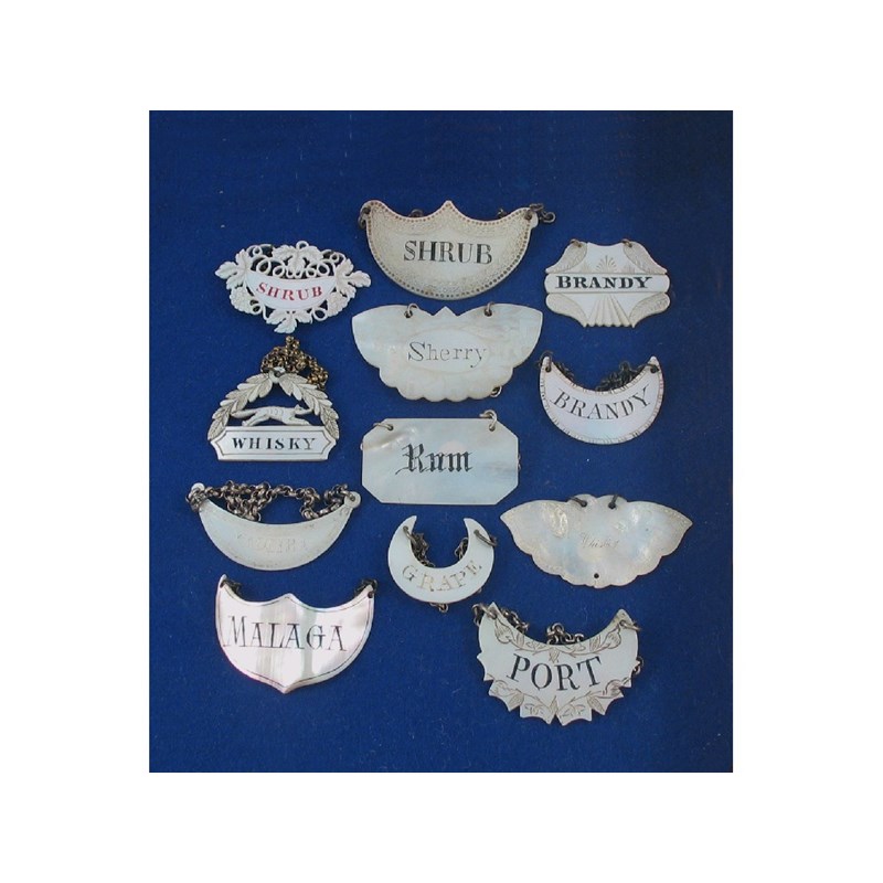Twelve assorted late 18th/19th century mother of pearl wine labels: "SHRUB", "BRANDY", "SHERRY", "WHISKY", "RUM", "BRANDY", "MADEIRA", "WHISKEY", "MALAGA", "GRAPE" and "PORT". (12)