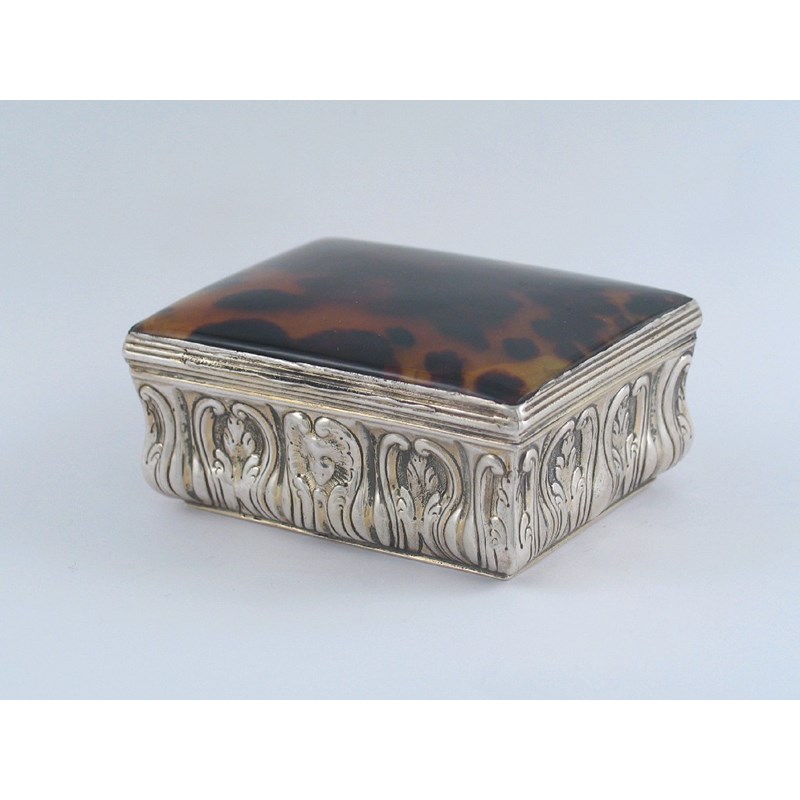 An 18th century oblong snuff box with a hinged, mounted tortoiseshell cover and a flat-chased trophy of arms on the base, the sides with embossed masks and scrolls in low relief, unmarked probably continental (German/Scandinavian) 1740-1760, 3in (7.5cm) wide.
