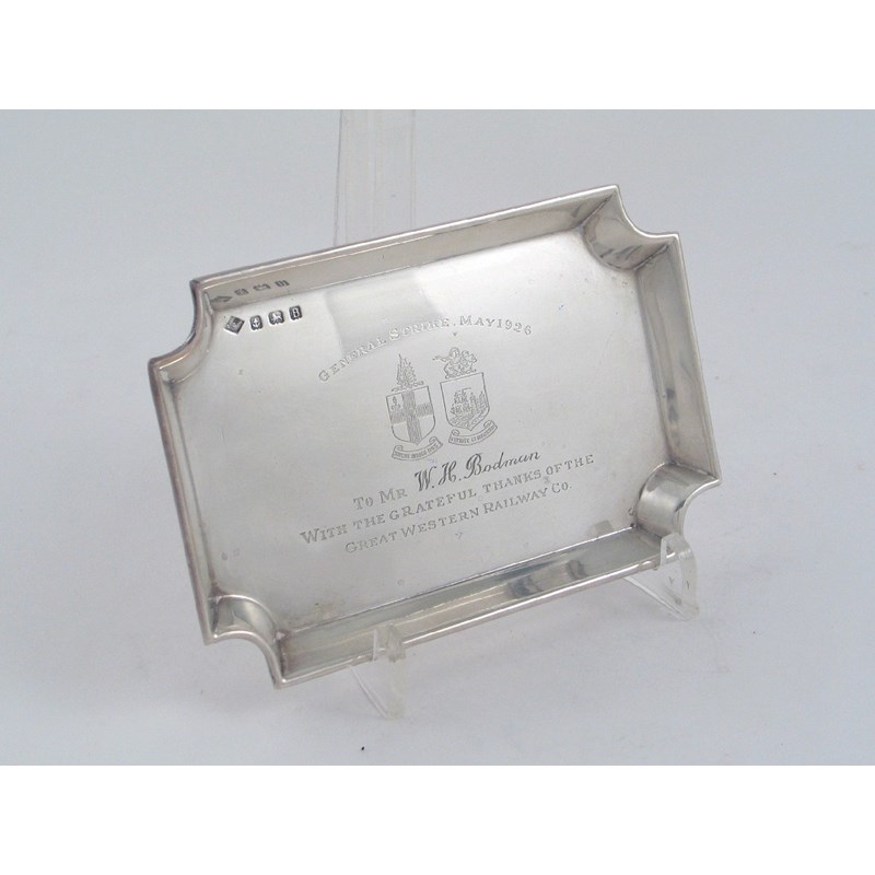 General Strike Interest: a modern pintray with incurved corners inscribed General Strike May 1926 To Mr W.H. Bodman with the grateful thanks of the Great Western Railway Co" and numbered "1845" maker ACB, Birmingham 1926, 5.2in (13.2cm) long, 4oz.
