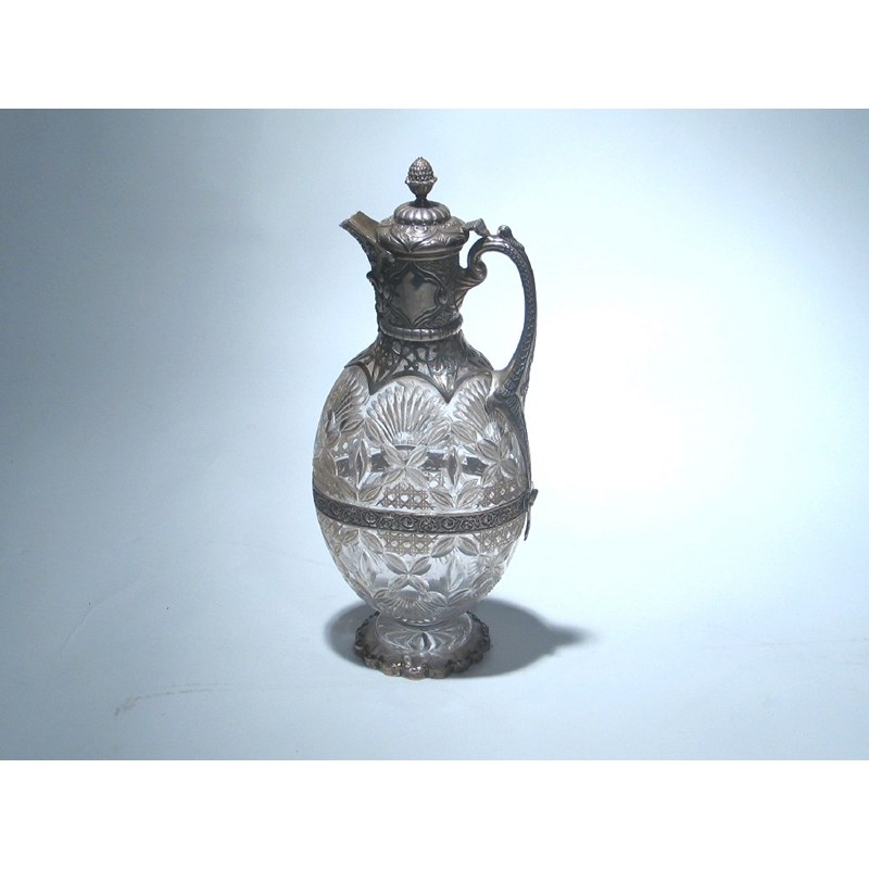 An Edwardian mounted cut glass claret jug with an oval, flask-shaped body and a mounted polyfoil foot, with an embossed mount, pierced mantle and a pierced strap or girdle around the body, by Mappin & Webb, London 1907, 13in (33cm) high.
