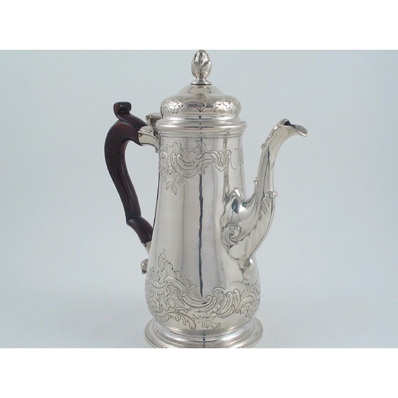 An early George II/III Scottish coffee pot, of tapering form chased with an upper and lower frieze of scrolls, flowers and foliage, with a bud finial and leaf wrapped spout, by John Robertson, Edinburgh 1760, 10in (25.5cm) high, 32oz.