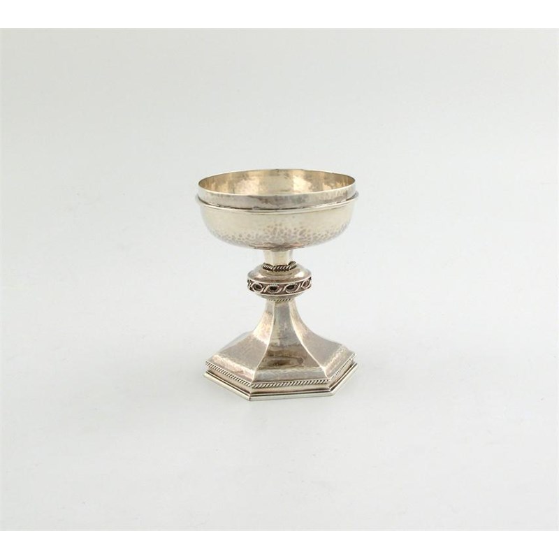 plain circular bowl, spot-hammered decoration, on a knopped stem, rope-work borders, on a raised hexagonal foot, height 10.5cm, approx. weight 5.5oz.