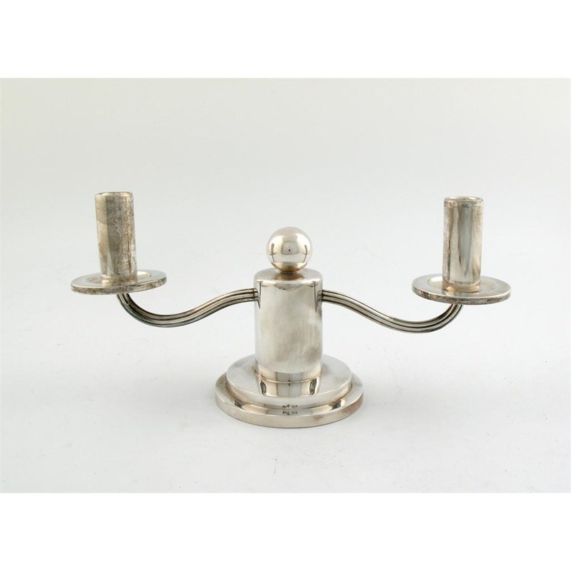 cylindrical central column with a ball finial and two fluted scroll arms, plain cylindrical capitals and drip pans, length 31.5cm, approx. weight 12oz.