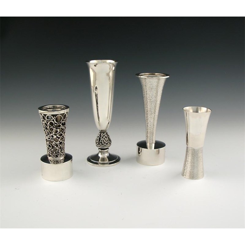 tapering cast textured foot, circular capital, height 11cm, plus a vase / candlestick, same date and maker, tapering circular textured form, height 15.3cm, a spirit measure, and another modern silver vase, by another maker, approx. total weight 18oz. (4)