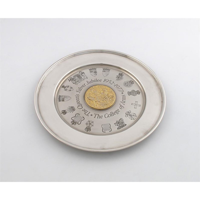 circular form, the centre embossed with the Royal Coat of Arms, and engraved with armorials, celebrating the Queen's Silver Jubilee, diameter 26.8cm, approx. weight 16oz.