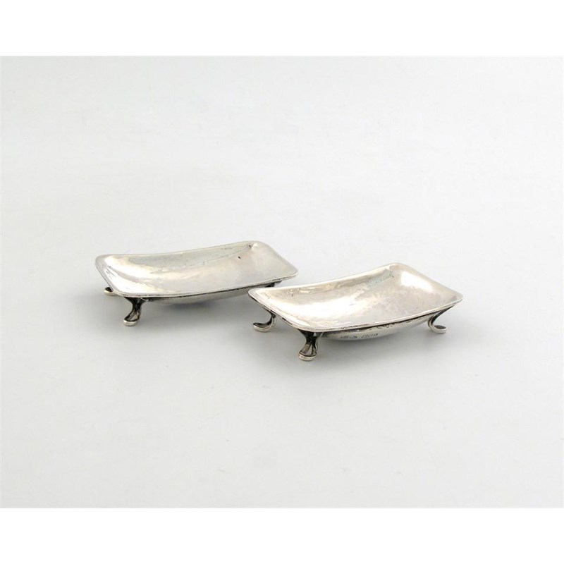rounded rectangular form, spot-hammered decoration, on four scroll feet, length 6.8cm, approx. weight 1.1oz. (2)