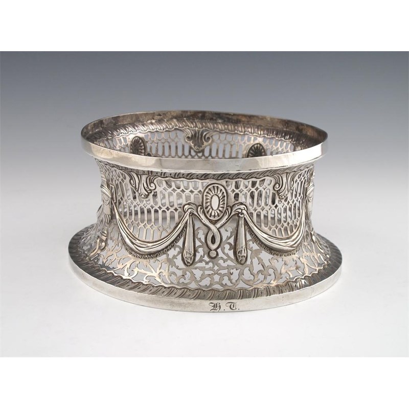 circular form, embossed with medallions, urns and drape decoration, on a pierced body, initialled, diameter of base 19.2cm, approx. weight 10oz.