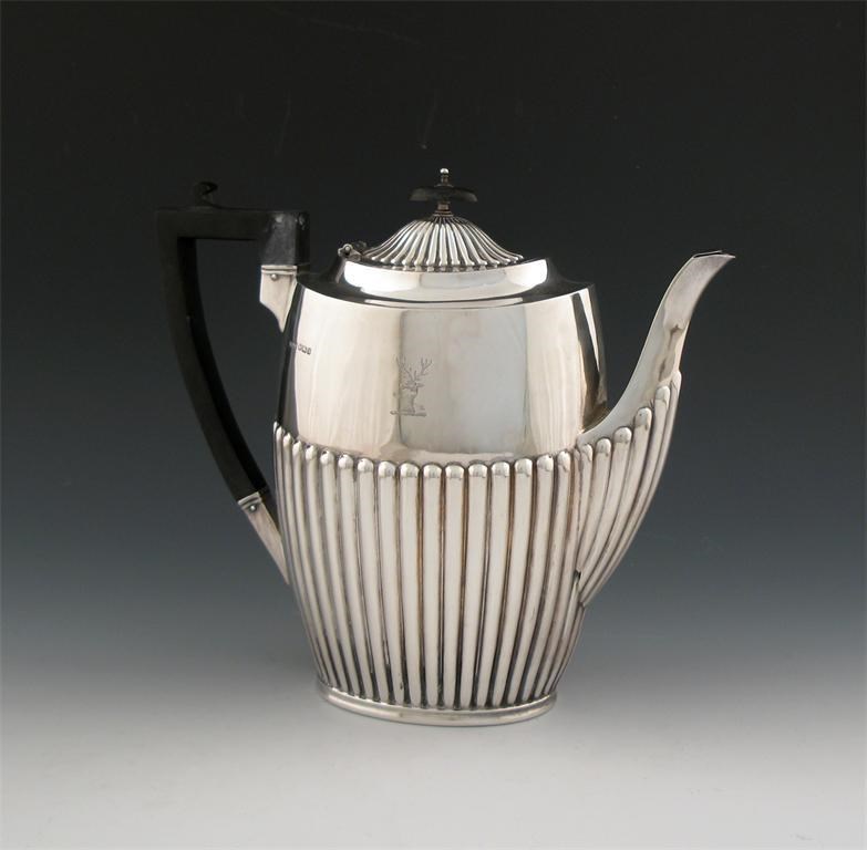 oval form, part fluted decoration, scroll handle, fluted-hinged cover, engraved with a crest, height 20.5cm, approx. weight 18oz.