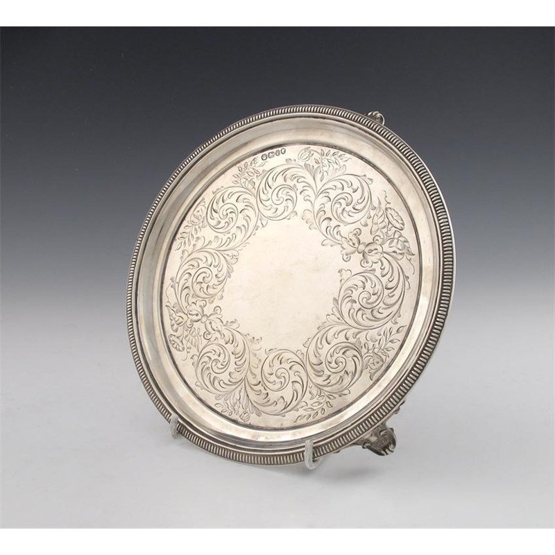 circular form, rope work border, the centre with engraved foliate scroll decoration, on three pierced bracket feet, diameter 20.9cm, approx. weight 11oz.