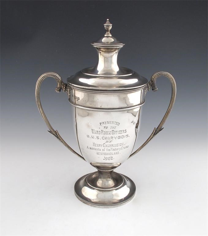vase form, reeded scroll handles, domed cover with an urn finial, inscribed 'Presented to the Ward Room Officers H.M.S Charybdis, by Henry Charrington, a memento of the Fishery Cruise Newfoundland 1902', on a beaded circular foot, height 33cm, approx. weight 33oz.
