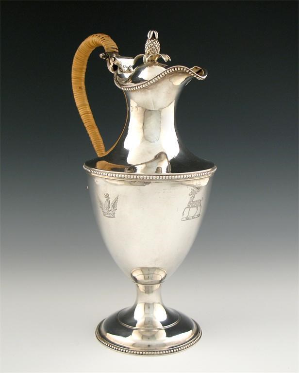 tapering vase form, beaded borders, wicker-bound scroll handle, on a raised circular foot, engraved with two crests, height 29.5cm, approx. weight 26oz.