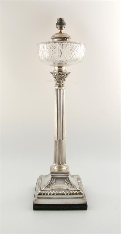 Corinthian column form, fluted stem, on a raised square base with a gadroon border, on a wooden base, with a cut-glass oil bowl, converted for electricity, total height 66cm.