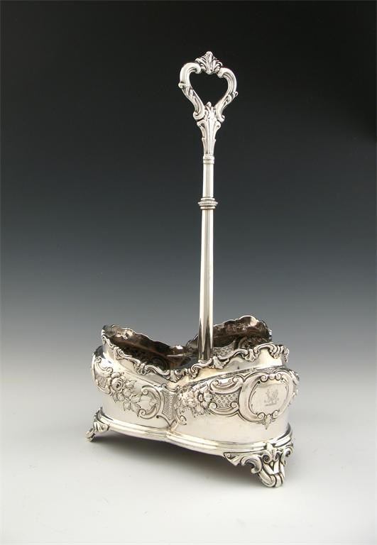trefoil form, embossed foliate scroll decoration, engraved with a crest, central leaf capped scroll carrying handle, wooden base, on three scroll bracket feet, height 38.5cm.